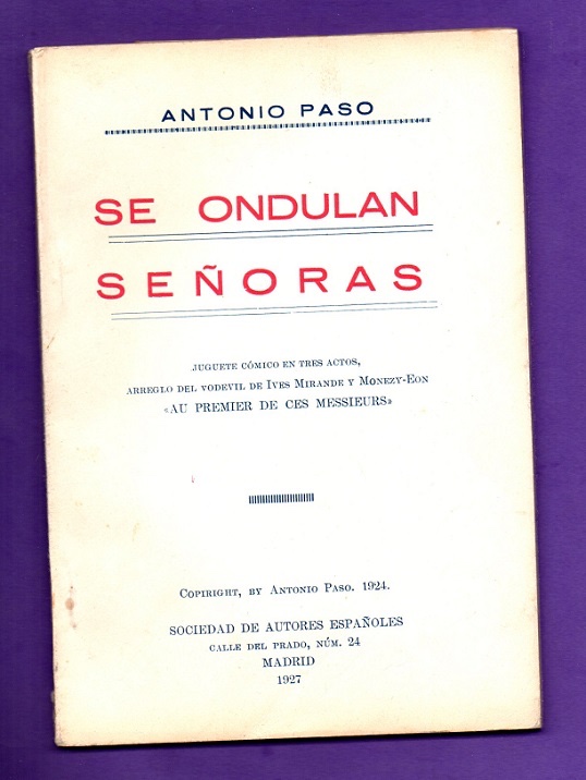 – Juguete cómico en tres actos, arreglo del vodevil de IVES MIRANDE y MONEZY-EON «Au premier de ces messieurs». Estrenado en el Teatro de la Comedia, de Madrid, el día 16 de abril de 1927.- Ejemplar intonso. >>> DESCUENTO ESPECIAL en caso de pasar a recoger en la librería (LLAMAR ANTES, libro en almacén). El envío fuera de la península podría conllevar gastos adicionales (avisamos antes).